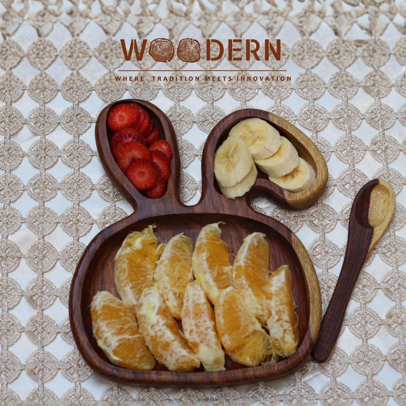 Handcrafted from 100% natural Sheesham wood, this adorable fixed tray is designed in the shape of a cute bunny face with three sections, perfect for serving meals or snacks in a way that encourages kids to enjoy their food.