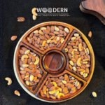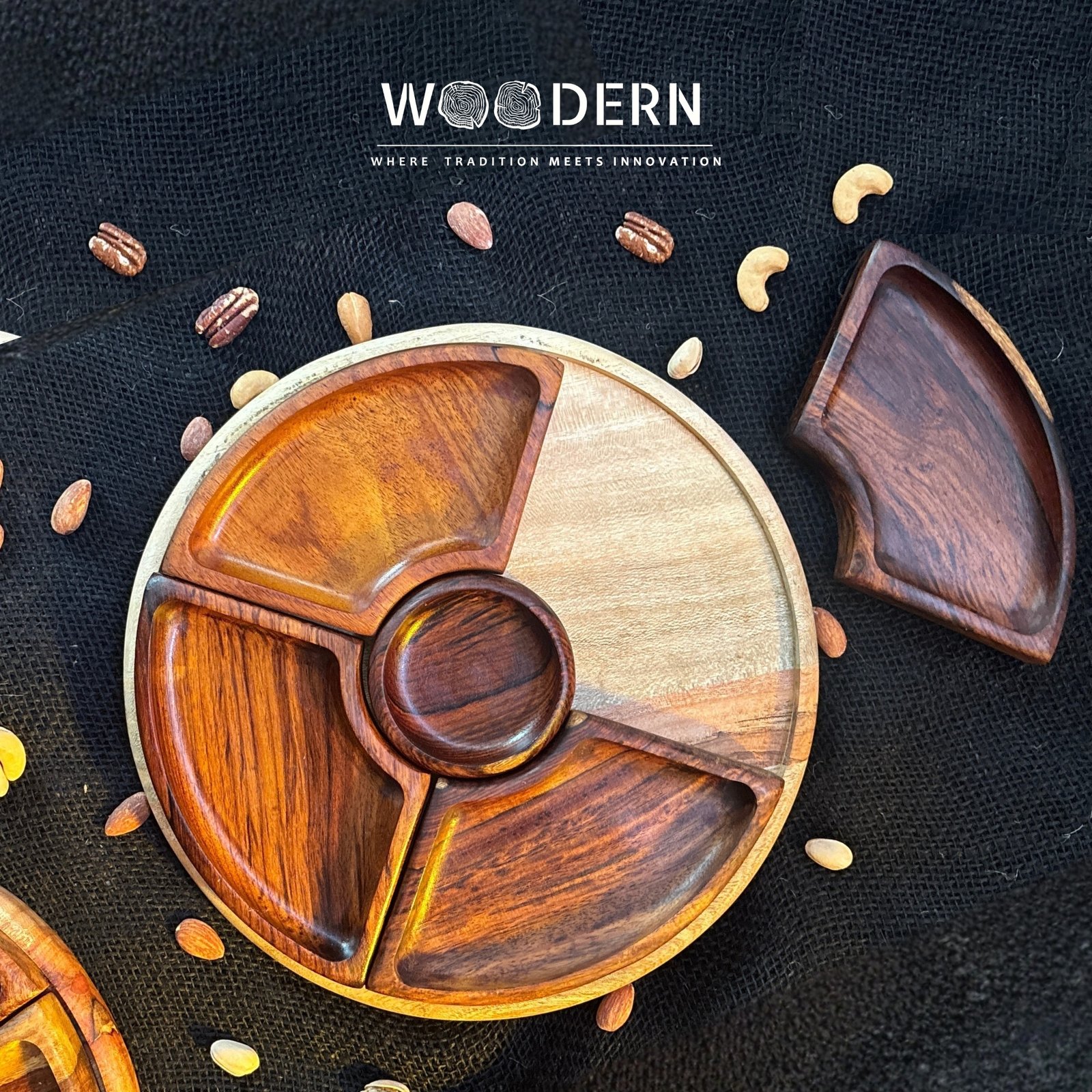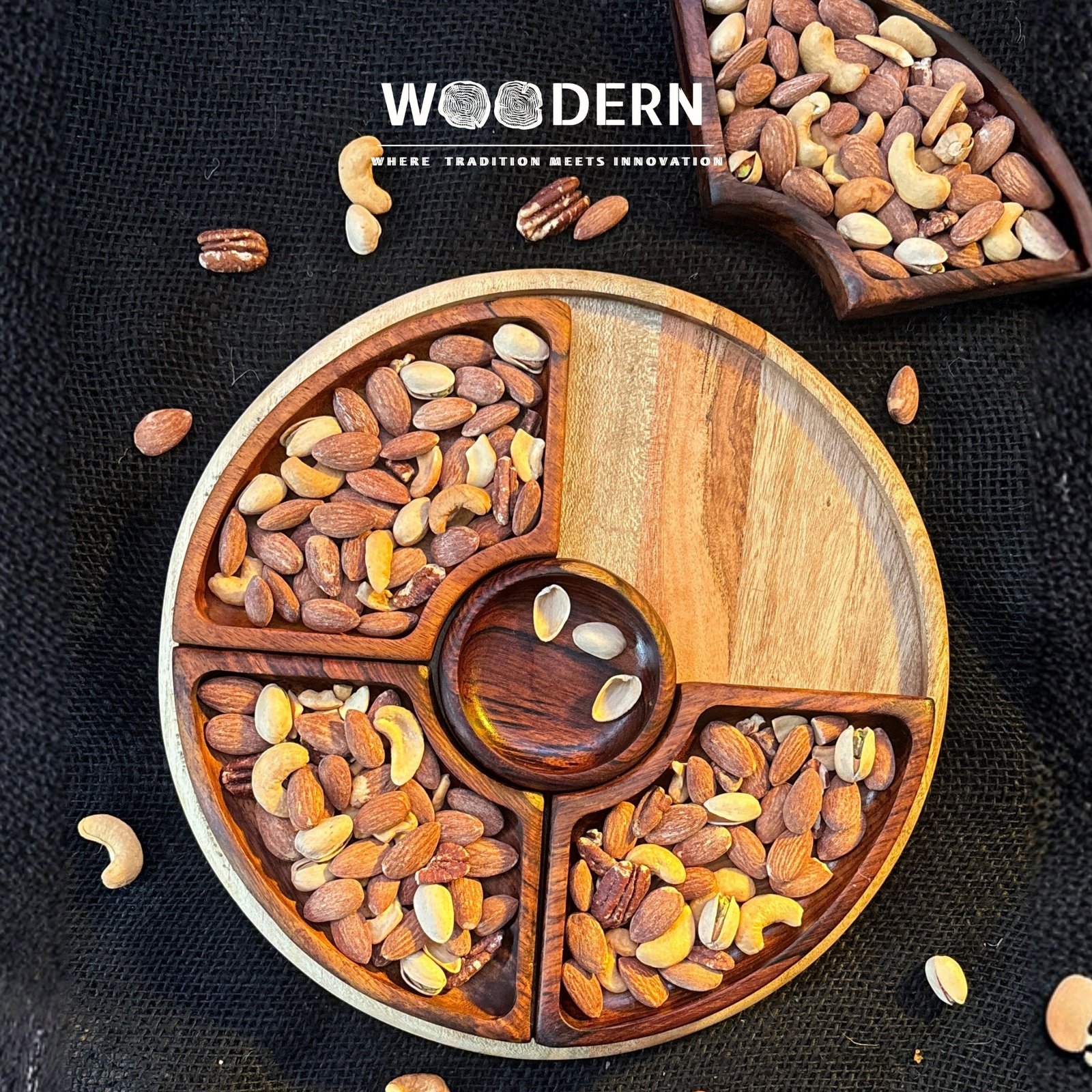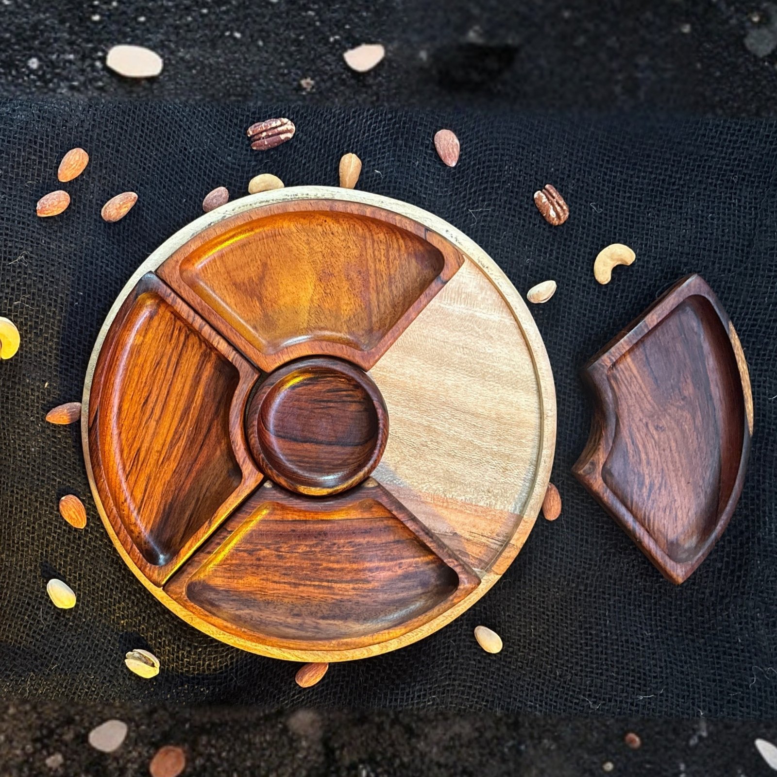 Beautifully handcrafted from 100% natural Sheesham wood, this round tray is designed with harmony and balance in mind. It includes one main base tray and five removable sections, perfect for serving a variety of nuts, snacks, or dried fruits in a neat and stylish way.