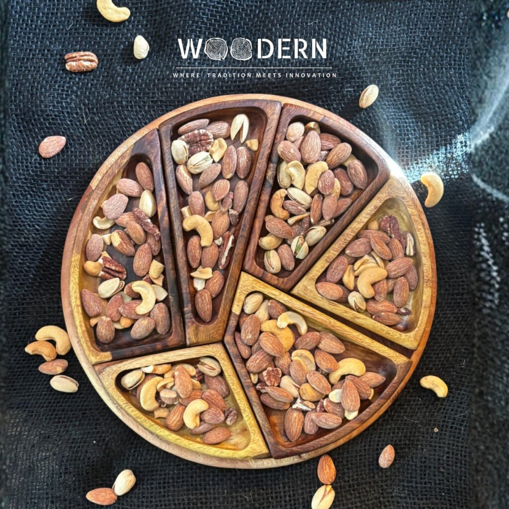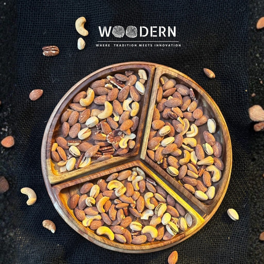 Handcrafted from 100% natural Sheesham wood, this elegant tray features a fixed design divided into three curved sections, perfect for serving assorted nuts, dried fruits, or snacks in a neat and stylish way.