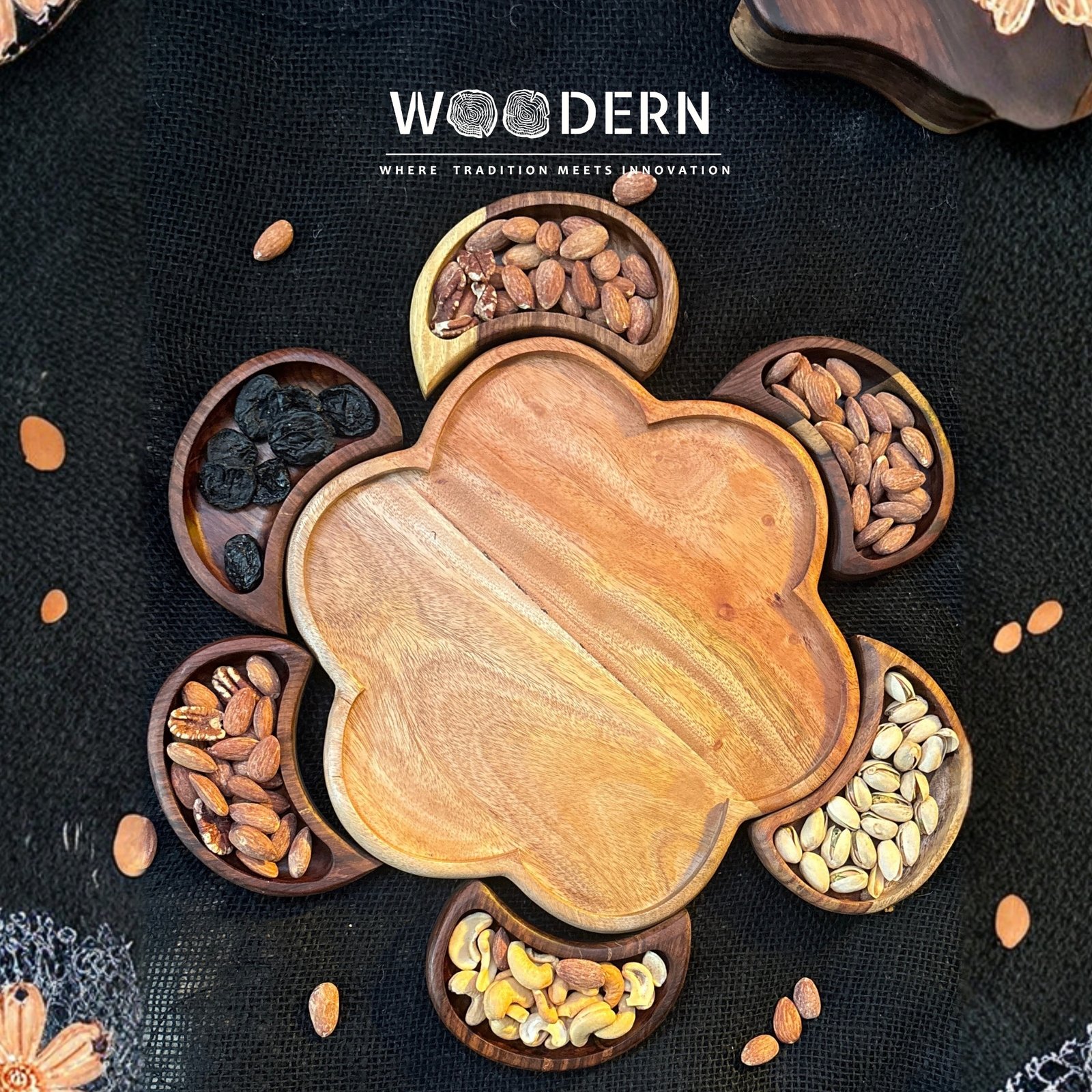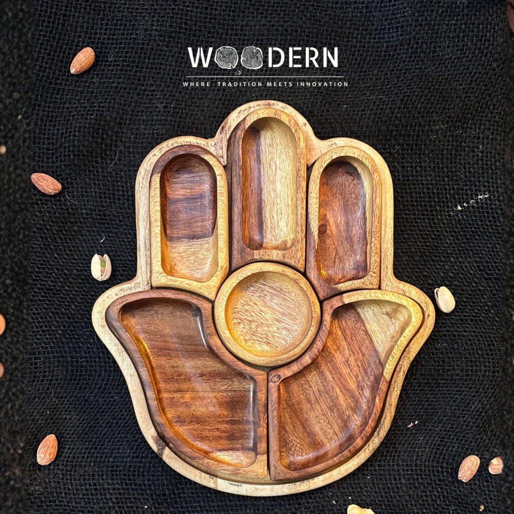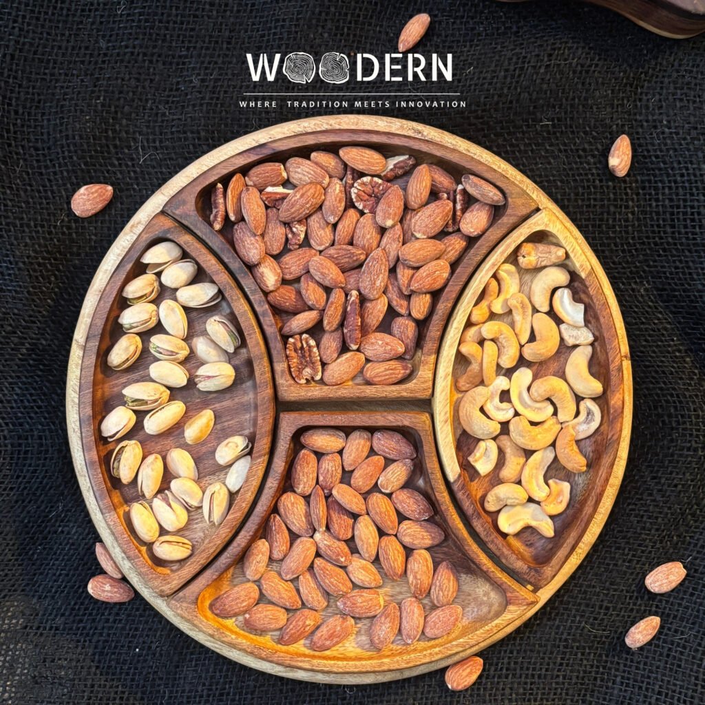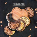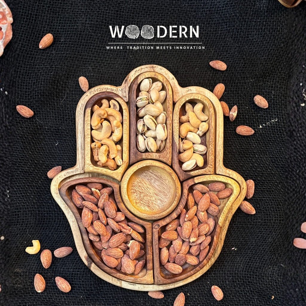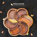 Crafted from 100% natural Sheesham wood, this elegant fan-shaped tray includes one main base tray and 6 detachable mini bowls, giving you the perfect way to serve nuts, dried fruits, dates, or candies in a stylish and organized way.