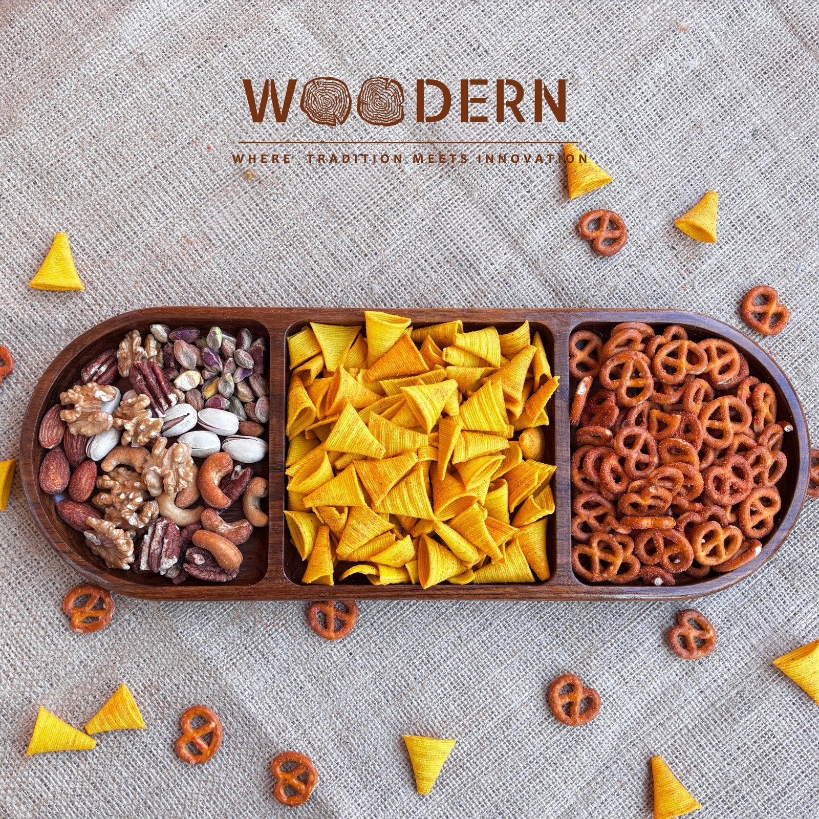 Handcrafted from 100% natural Sheesham wood, this elegant rounded rectangular tray features three spacious sections, perfect for serving breakfast, snacks, or a mix of dips, fruits, and treats ? all in one stylish setup.