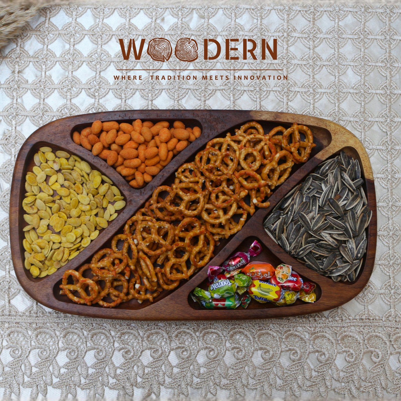 Handcrafted from 100% natural Sheesham wood, this elegant serving piece features a fixed design with five flowing sections, perfect for serving a mix of nuts, dried fruits, or snacks with style and balance.