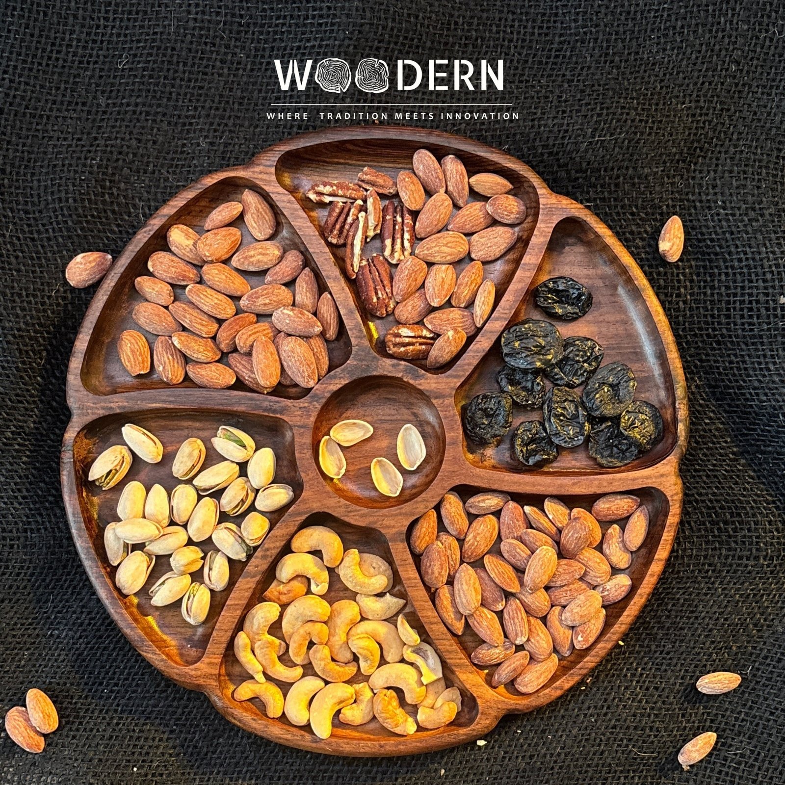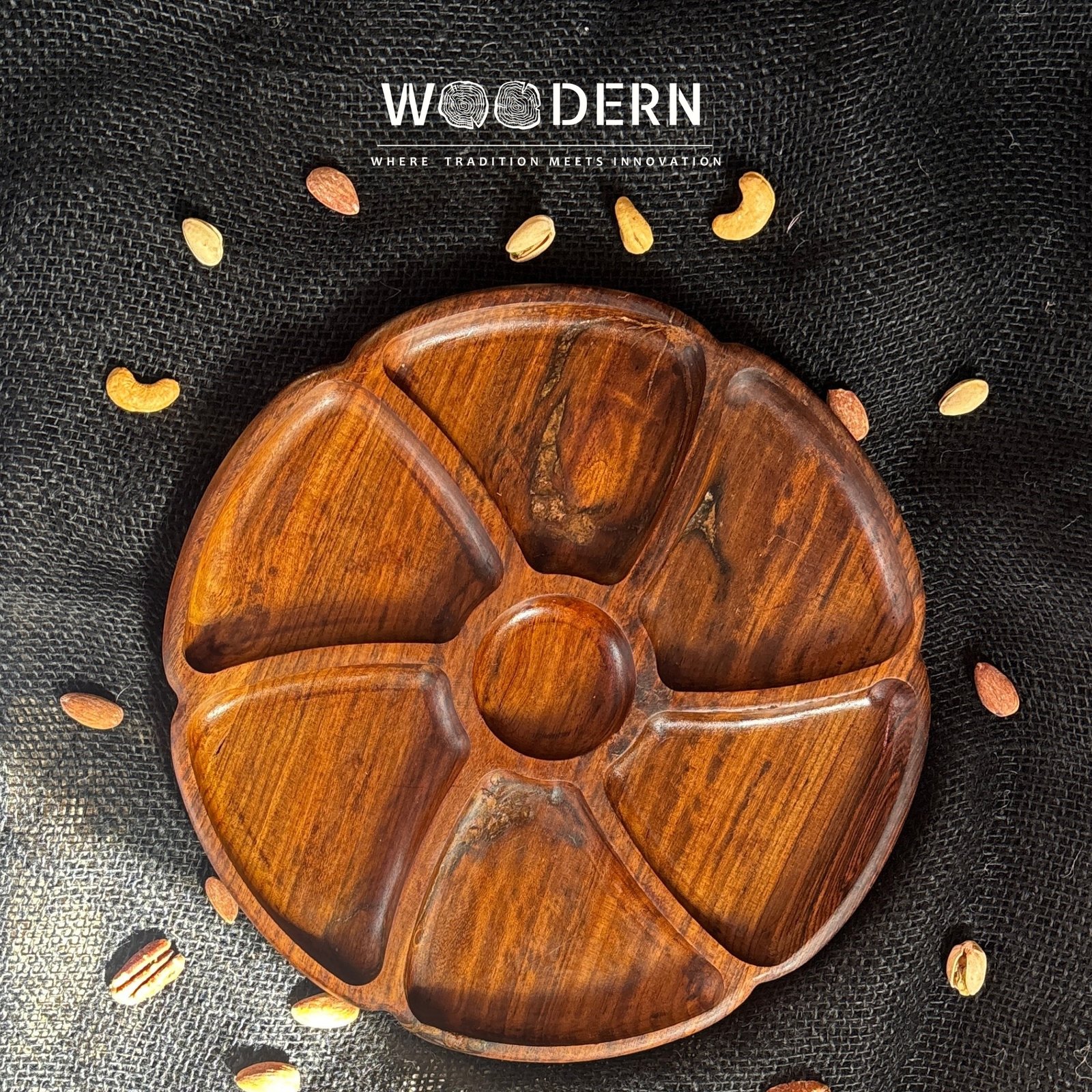 Beautifully handcrafted from 100% natural Sheesham wood, this round tray is designed with seven neatly divided sections, perfect for serving a mix of nuts, dried fruits, or snacks in an organized and stylish way.
