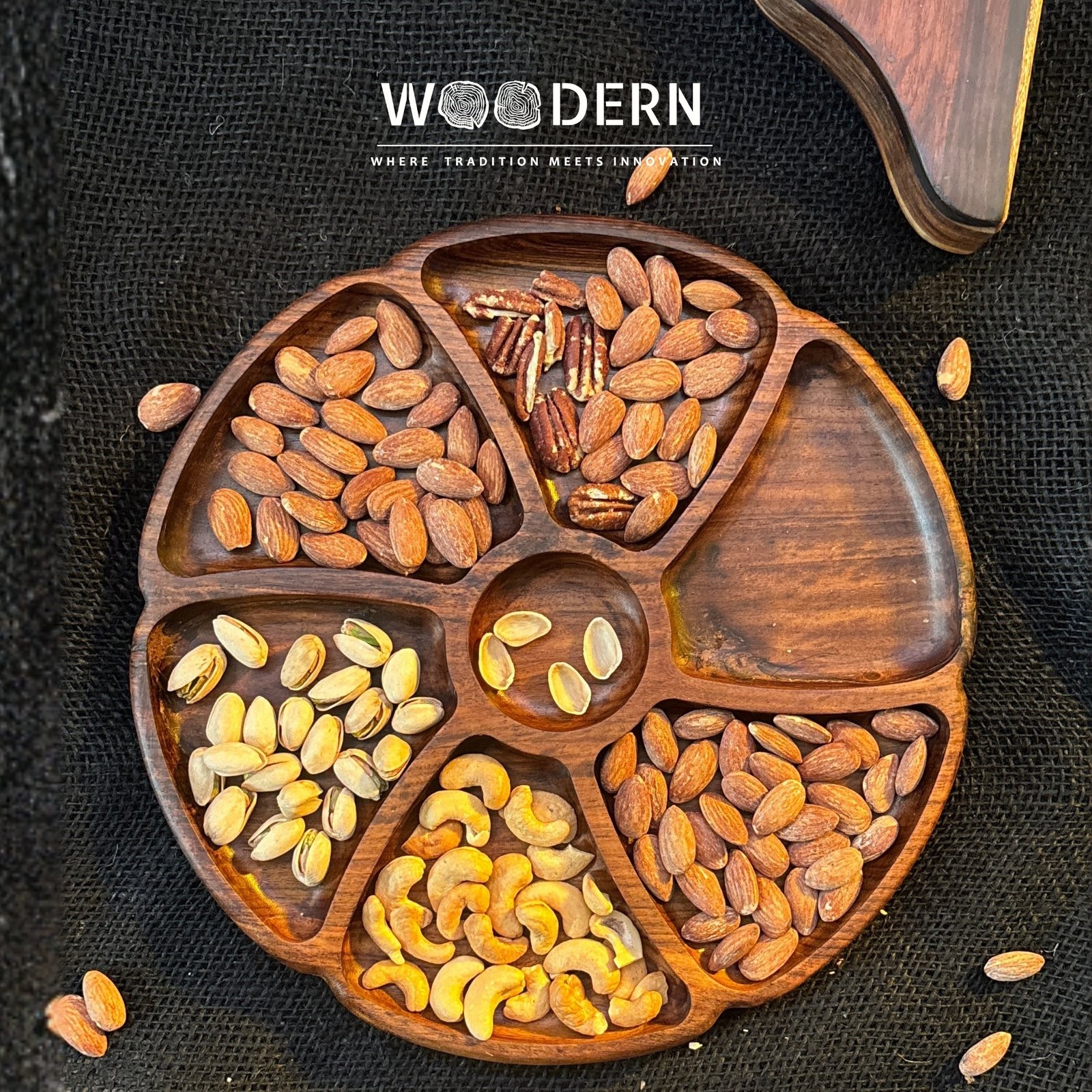 Add a natural touch of elegance to your serving with the Woodern Wheel Nuts Tray.